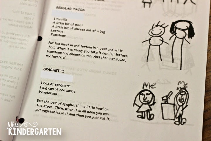 After each kid shared their recipes and I typed them up, I gave them a post it note to draw a picture of them and their moms making their favorite meal. Then we stuck the post-its on each page and made enough copies to make a book for each kid.