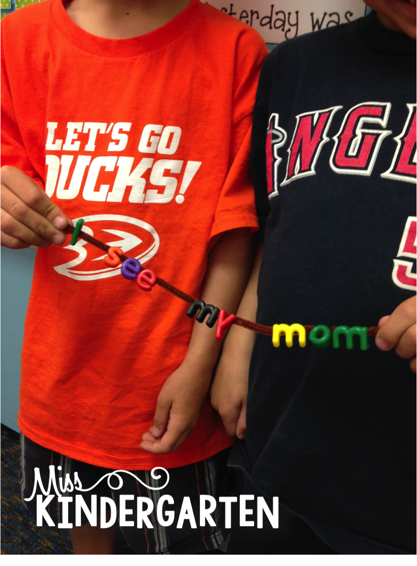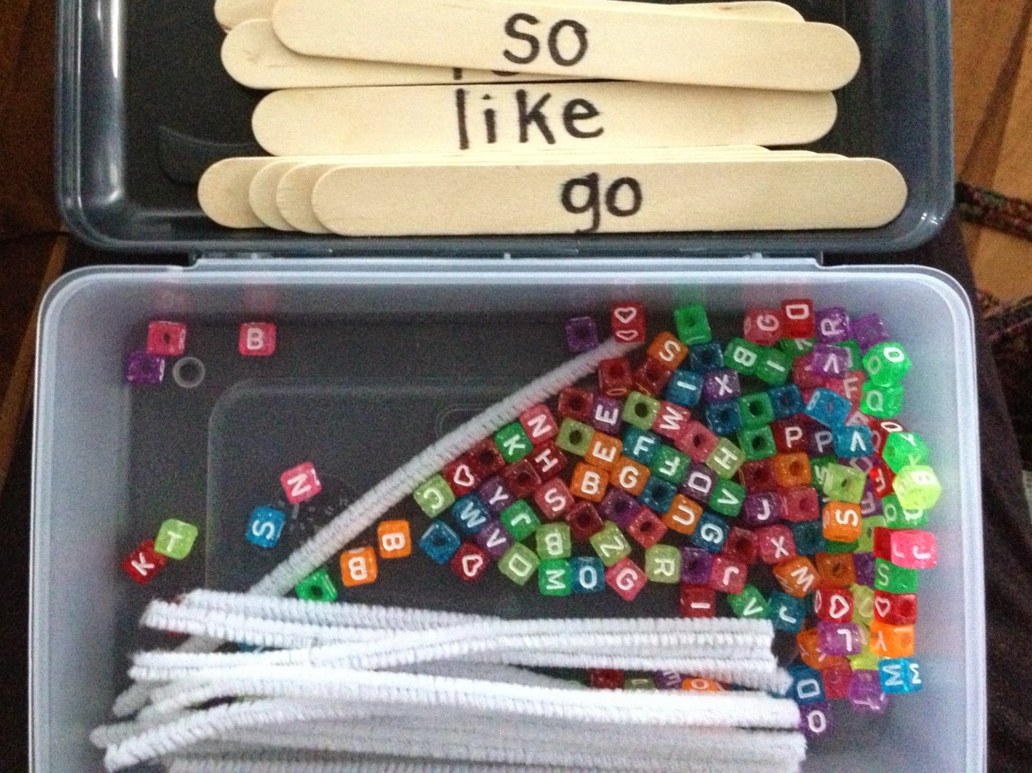 It was really simple to put together! I just wrote some of our sight words on jumbo craft sticks, and stuck some pipe cleaners and our letter beads into the basket. The kiddos pick a sight word stick, read the word, and build it with the letter beads.