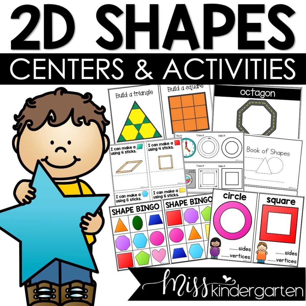 Many of the activities I mentioned above would be perfect for math centers in your kindergarten classroom. In fact, I have compiled my ten favorites into a collection of 2D Shapes Centers and Activities! These activities include practice opportunities for 12 different two-dimensional shapes. These shape centers are perfect for kindergarten, Pre-K, and preschool!